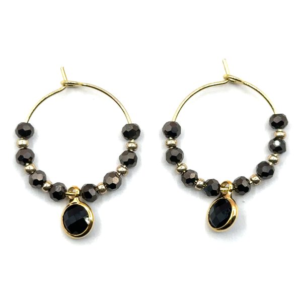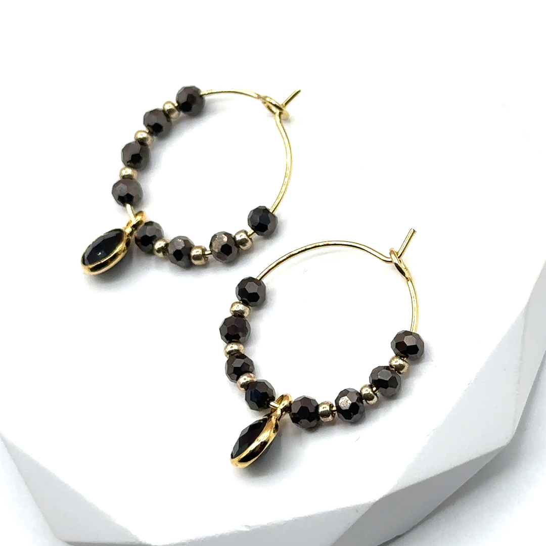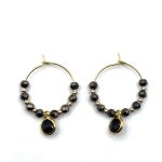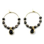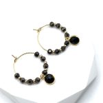 Klassisch und doch auffallend: Diese handgefertigten Creolen vereinen facettierte Glasperlen in tiefem Schwarz mit feinen goldfarbenen Elementen. Ein schwarzer, runder Anhänger setzt den eleganten Mittelpunkt und macht die Ohrringe zu einem stilvollen Statement.