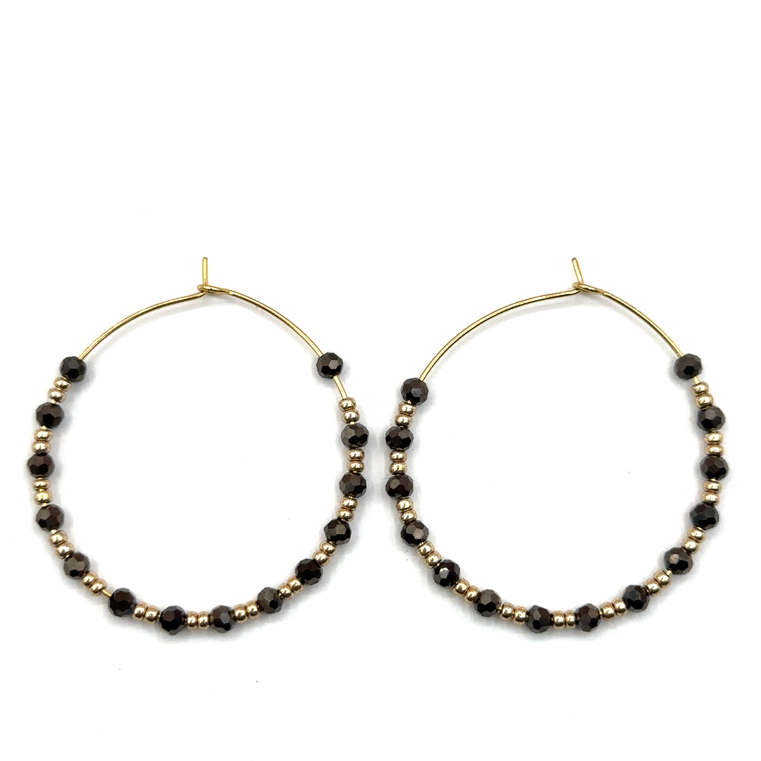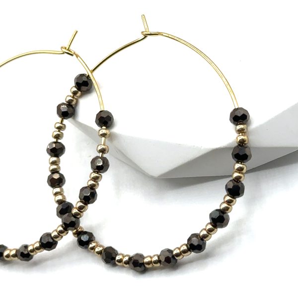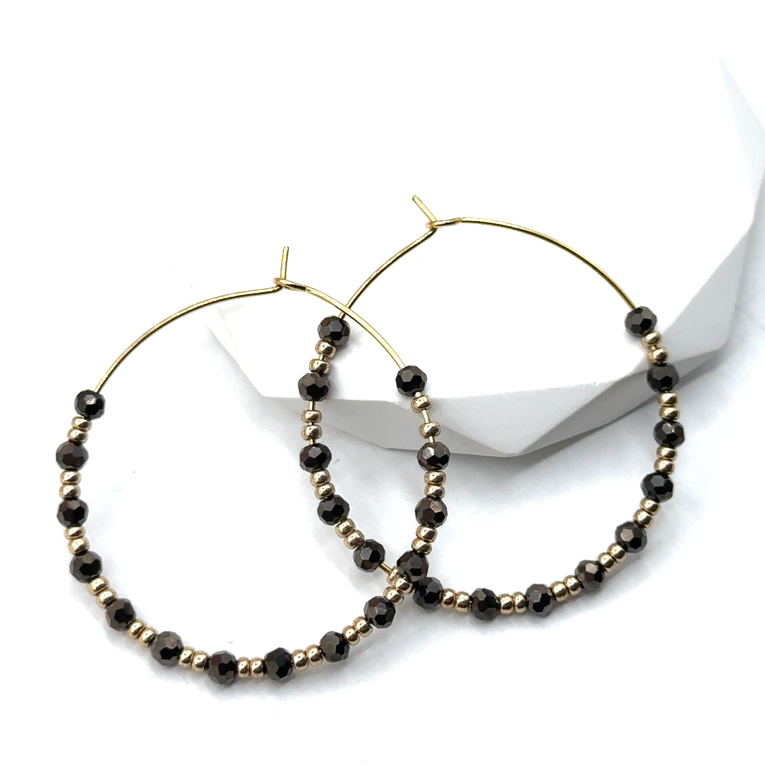 Feine Creolen, besetzt mit facettierten Glasperlen in elegantem Schwarz, kombiniert mit edlen Gold-Details. Das dezente Funkeln macht sie zu einem modernen Begleiter für Alltag und Abend – leicht, stilvoll und zeitlos.