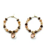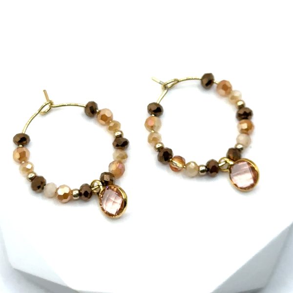 Diese handgefertigten Creolen vereinen warme Erdtöne mit einem edlen Funkeln. Facettierte Glasperlen in Beige-, Karamell- und Schokoladennuancen wechseln sich mit feinen goldfarbenen Akzenten ab. Als Highlight schmückt ein roséfarbener, tropfenförmiger Anhänger jede Creole – feminin, elegant und dennoch modern.