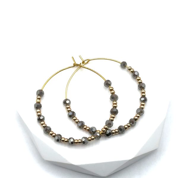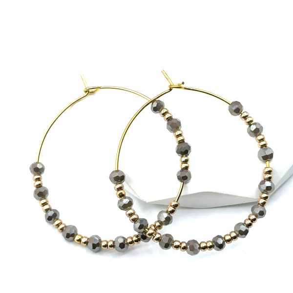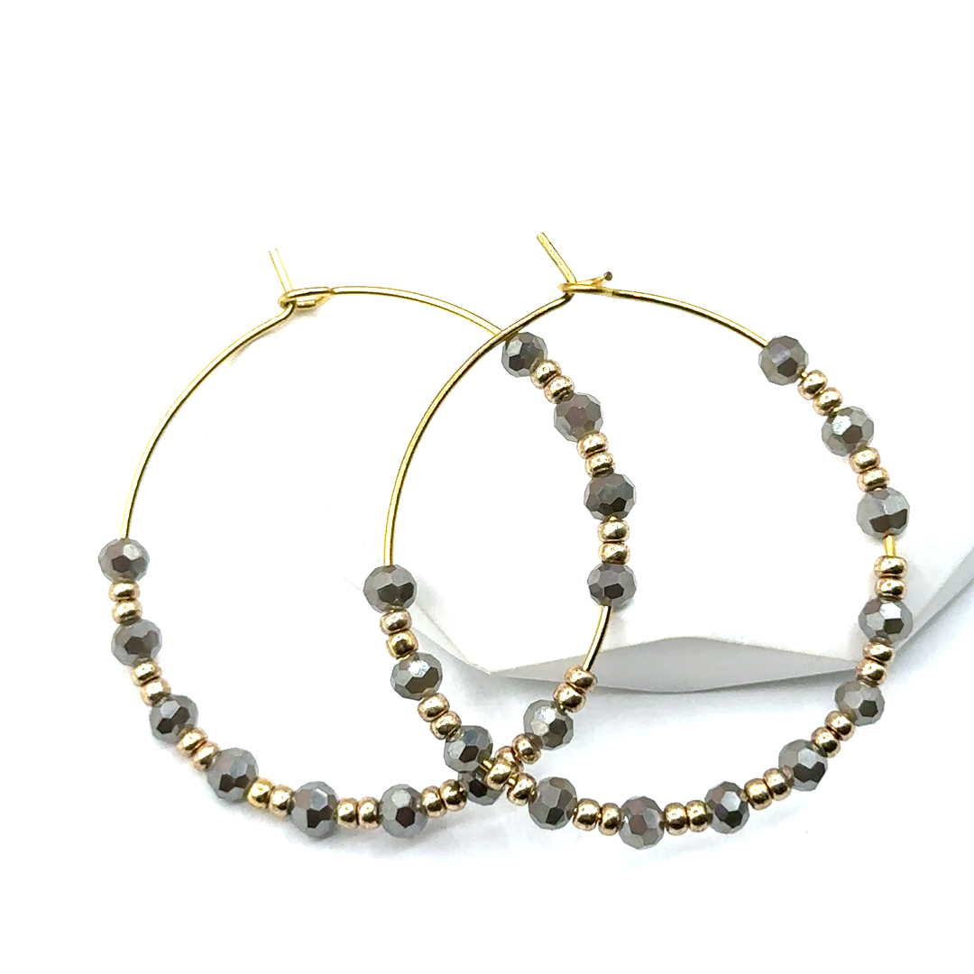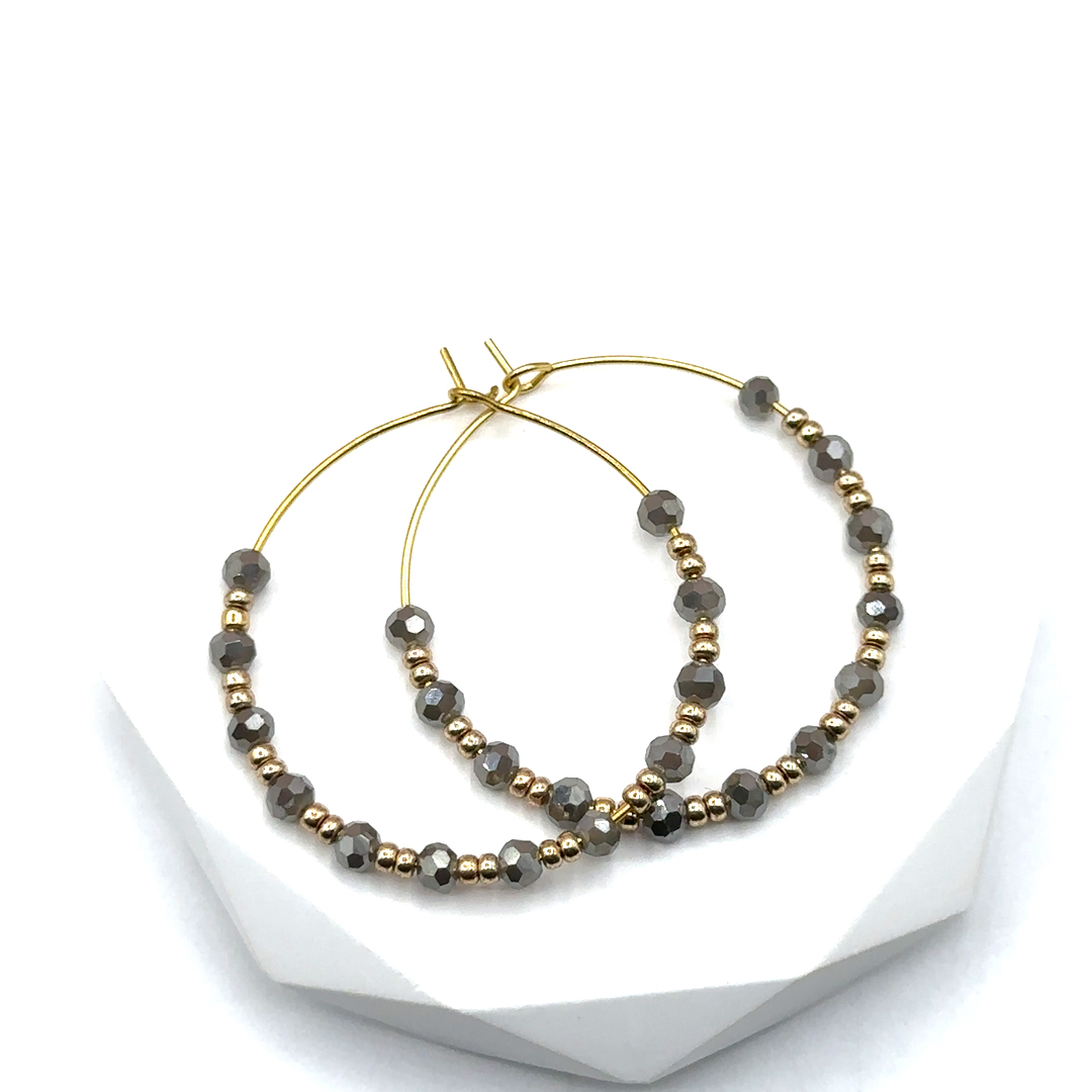 Moderne Creolen mit grauen, facettierten Kristallperlen und goldenen Details. Leicht, stylisch und ein echter Eyecatcher – vom Alltag bis zum Abendlook.