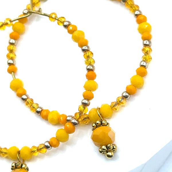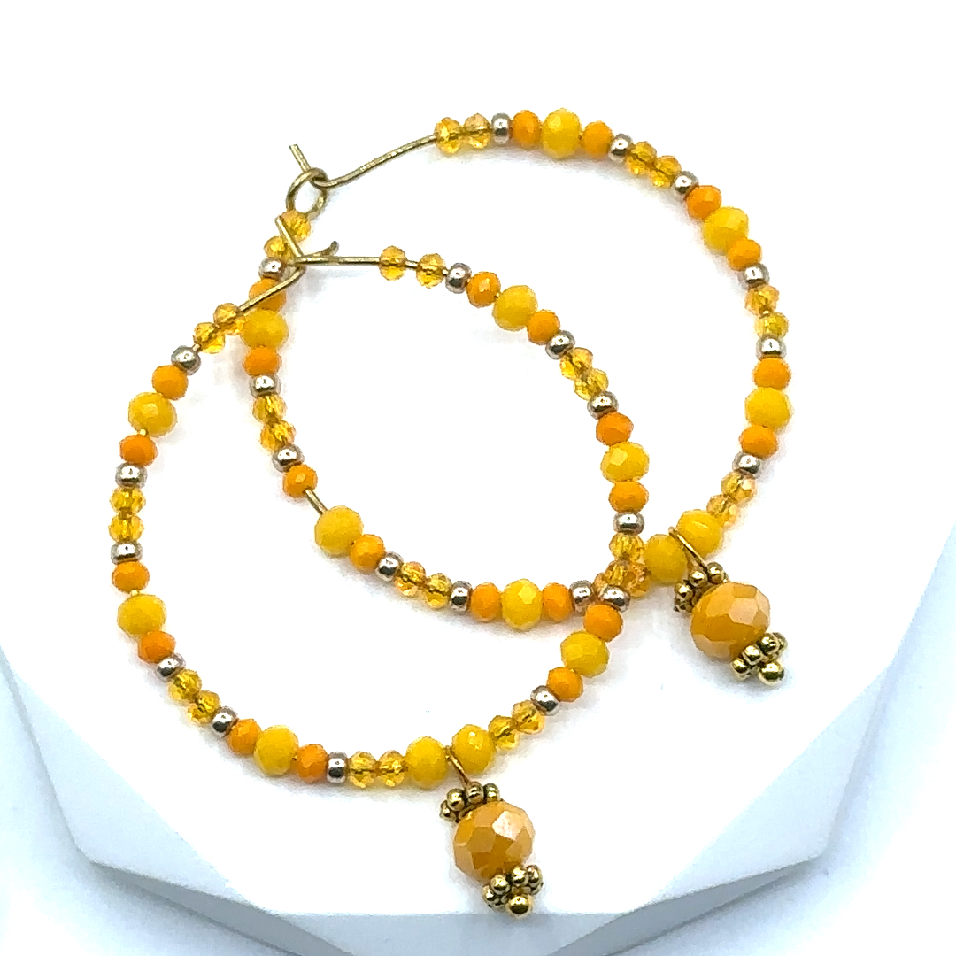 Strahlende Creolen mit facettierten Kristallperlen in sonnigem Gelb und Orange. Goldene Details und ein zarter Anhänger setzen leuchtende Akzente. Ein fröhlicher Eyecatcher, der Sommerfeeling und gute Laune in jedes Outfit bringt.