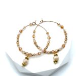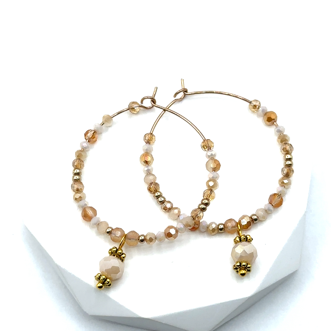 Creolen in warmen Nude- und Beigetönen, verziert mit facettierten Kristallperlen und goldenen Details. Ein schimmernder Anhänger rundet den Look ab. Modern, leicht und vielseitig kombinierbar – perfekt für elegante Outfits und trendige Styles