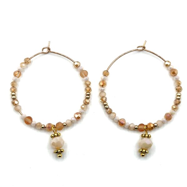 Stylishe Creolen mit facettierten Kristallperlen in Nude- und Beigetönen, kombiniert mit goldenen Details. Ein schimmernder Anhänger sorgt für den modernen Twist. Leicht, trendig und vielseitig – ein Must-have für alle, die Eleganz jung und frisch tragen wollen.