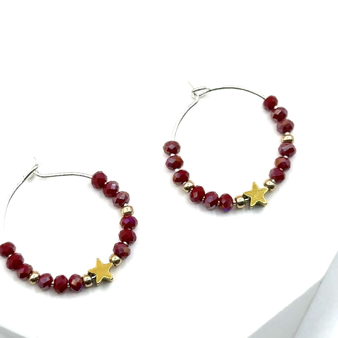 Feine Creolen, die mit funkelnden,facettierten Glasperlen in edlem Burgundy und sanften Goldakzenten mit Stern.