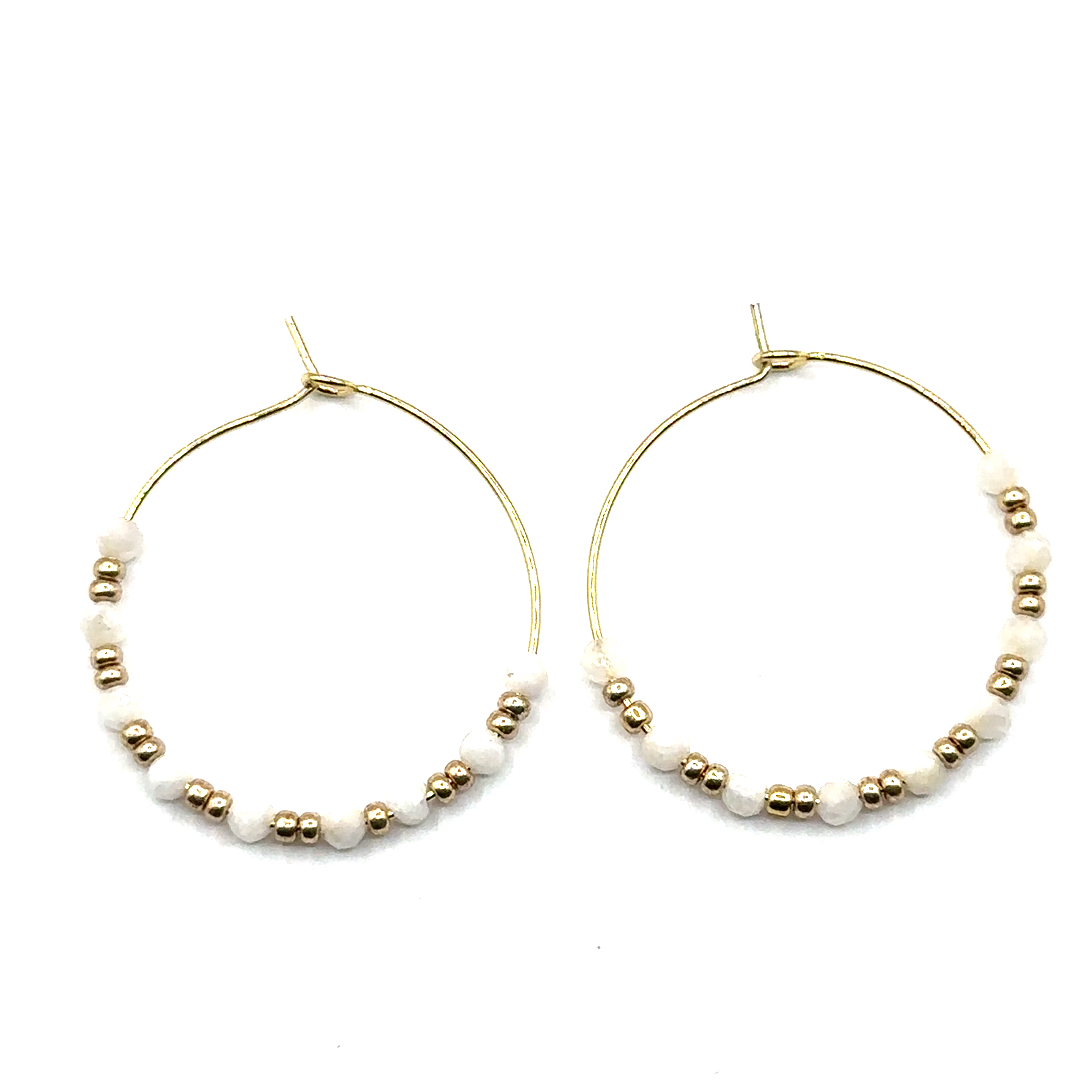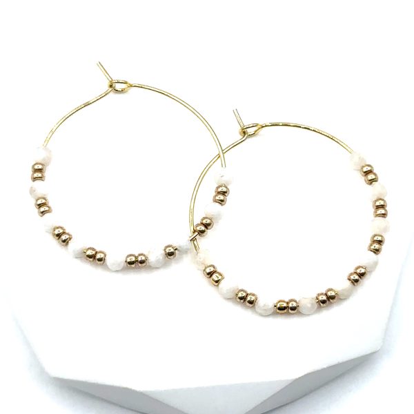 Minimalistische Creolen mit facettierten Halbedelsteineperlen in Weiß, kombiniert mit goldenen Details. Leicht, modern und zeitlos – ein stilvoller Begleiter, der Eleganz und Schlichtheit perfekt vereint.