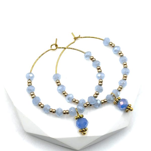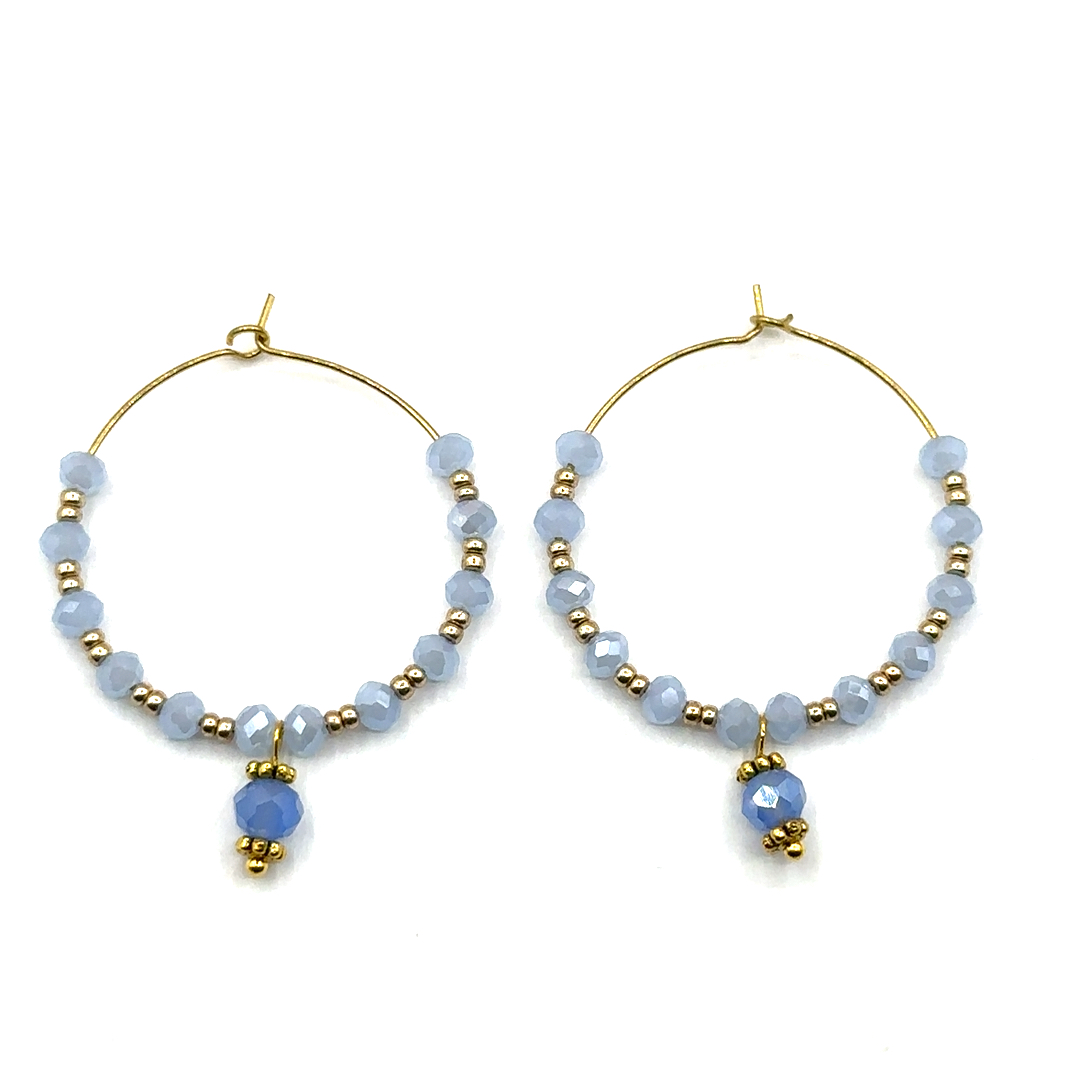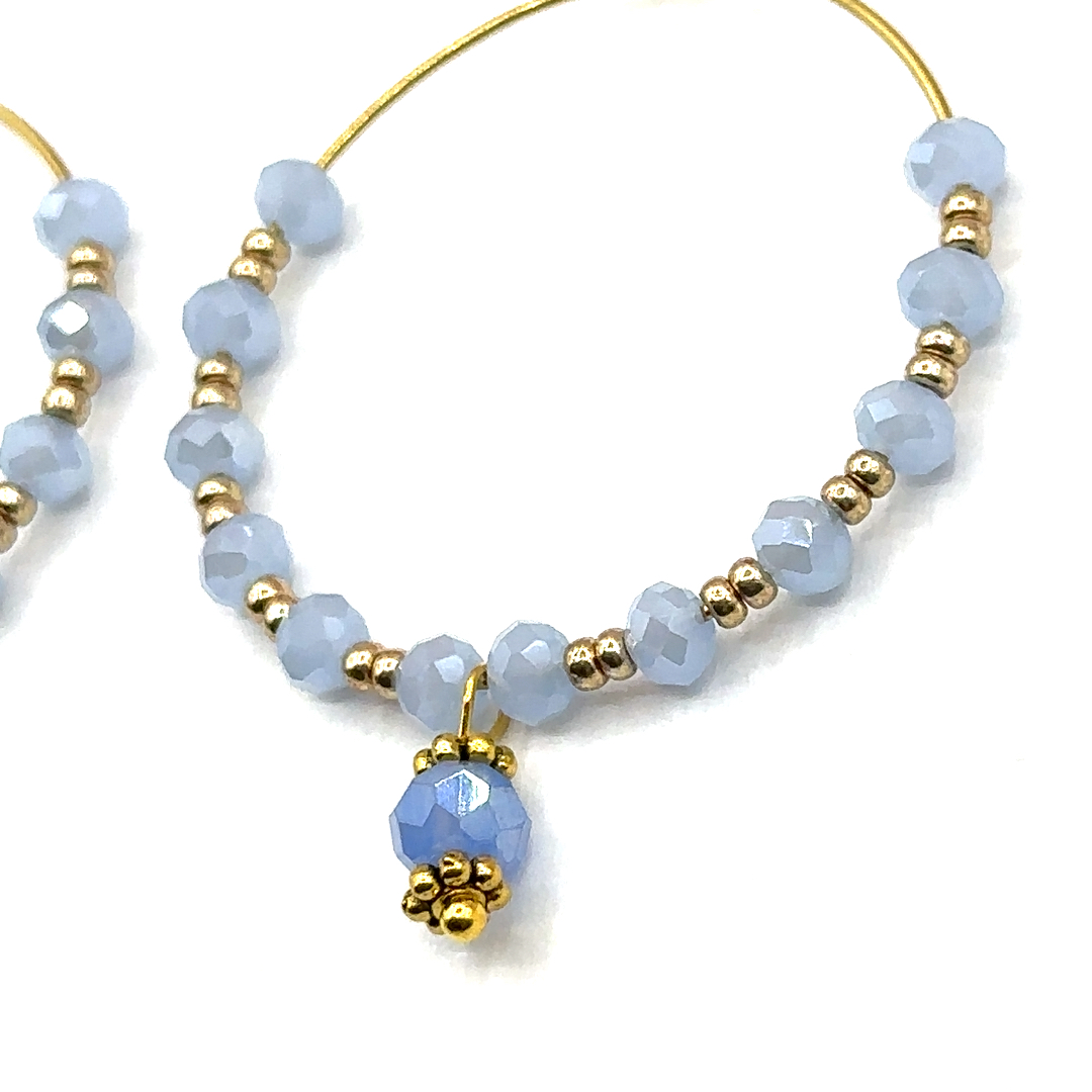 Wunderschöne Creolen mit facettierten Kristallperlen in sanftem Himmelblau. Goldene Zwischenelemente verleihen edlen Glanz, während ein kleiner blauer Anhänger den Look modern und elegant abrundet. Leicht, stilvoll und voller Frische.