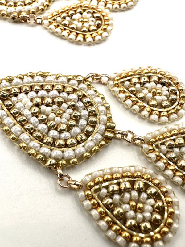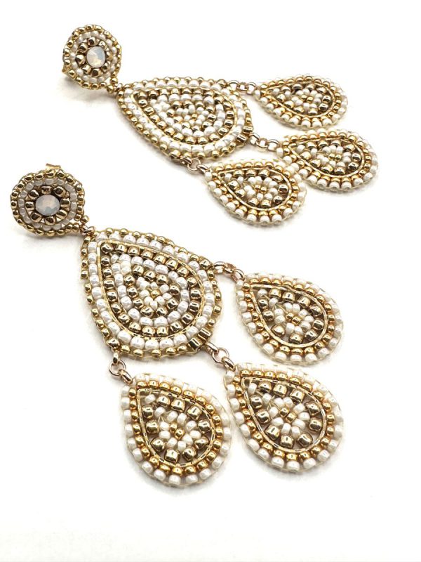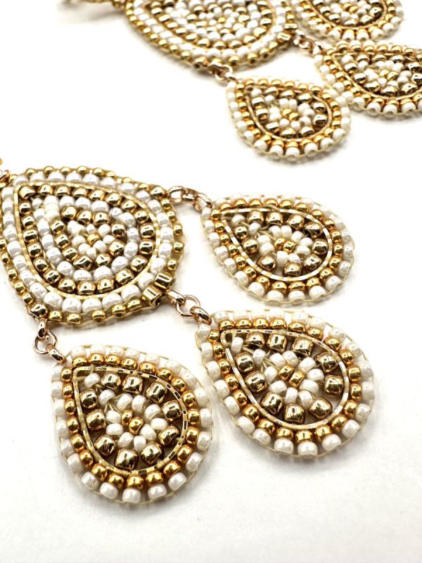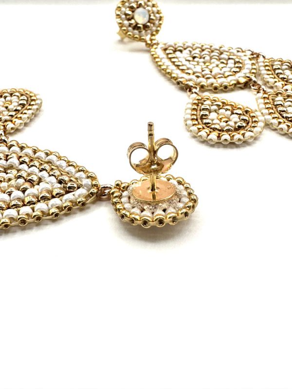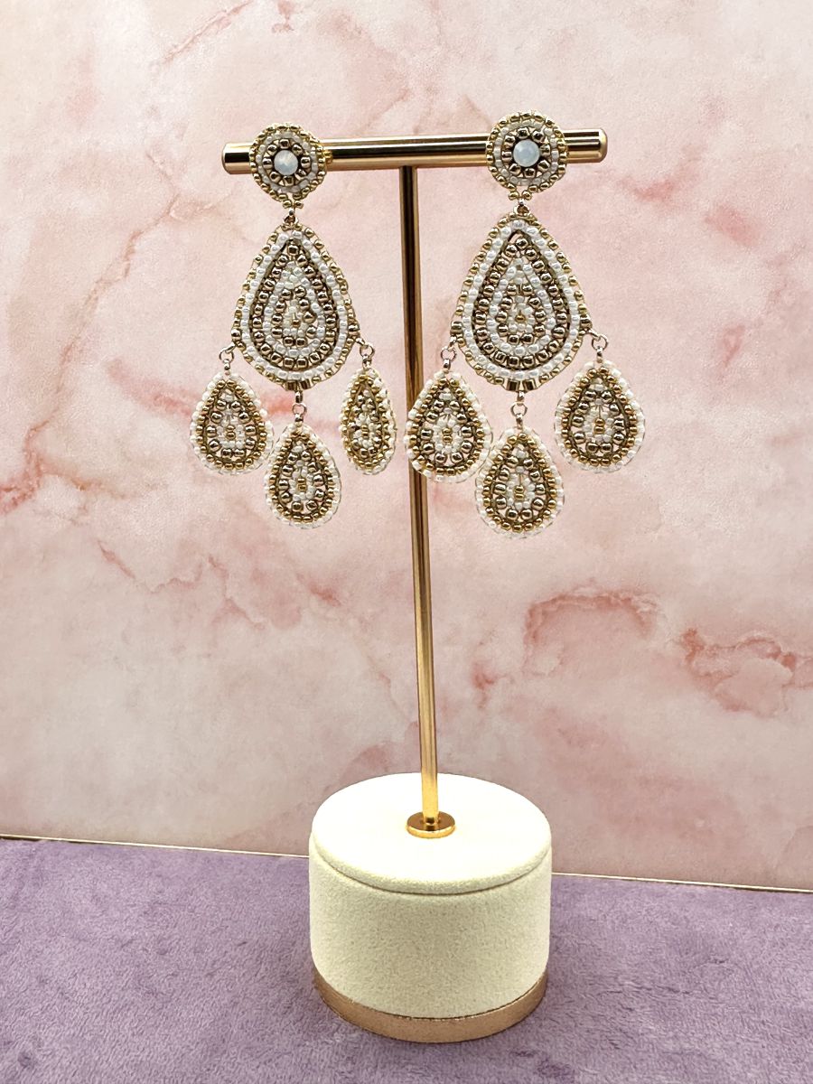 Diese Chandelier Ohrstecker werden aus vergoldetem 925 Sterling Silber gefertigt und in sorgfältiger Handarbeit mit schimmernden Perlen und goldfarbenen Akzenten veredelt. Das kunstvolle Tropfendesign lässt die Elemente bei jeder Bewegung zart schwingen.
