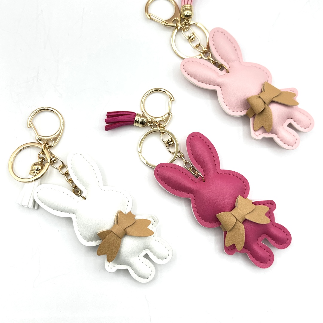 Die weichen Kunstleder-Bunnies sind liebevoll verarbeitet, mit zarter Nahtführung und einer kleinen Schleife aus Feinsynthetikleder verziert.